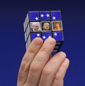 Cubo de rubik con las imágenes de tres altos cargos de la Unión Europea