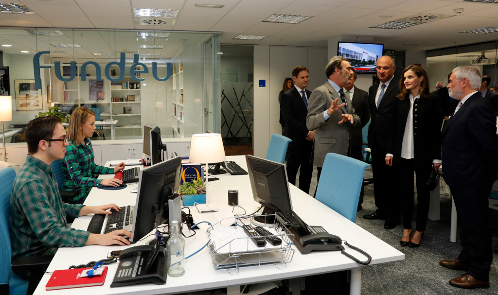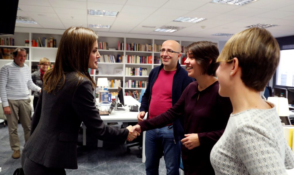La reina saluda al equipo de la Fundéu BBVA durante su última visita, el 10 de enero de 2018.