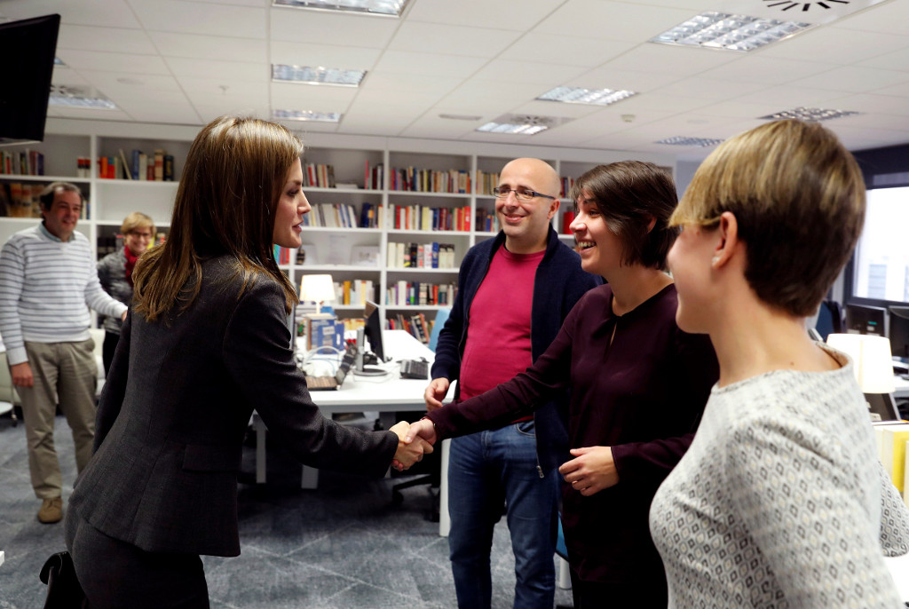 La reina saluda al equipo de la Fundéu BBVA durante su última visita, el 10 de enero de 2018.