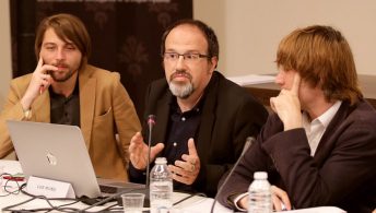 Luis Muiño (c), Juan Soto Ivars (i) y Jordi Corominas (d) durante el primer debate del seminario sobre lenguaje y posverdad.