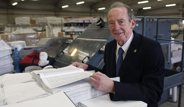 ESPAÑA DICCIONARIO RAE:GRA164 POLINYÀ (BARCELONA), 30/09/14. El director de la Real Academia Española, José Manuel Bleuca, posa en los talleres de impresión de CPS – Egedesa, en la localidad barcelonesa de Polinyà, donde ha presentado los procesos de alzado, cosido, encuadernado y estuchado del nuevo diccionario, cuya 23 edición aparecerá el próximo 26 de octubre. EFE/Alejandro García