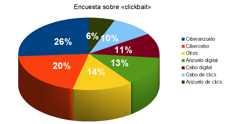 Muy por delante de anzuelo digital (13 %), cebo digital (1 1%), cebo de clics (10 %) y anzuelo de clics (6 %).