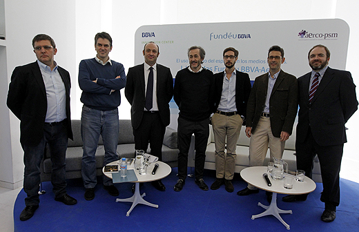 ESPAÑA FUNDEU REDES: MADRID, 28/03/2012.- Mario Tascón, Guillermo de Haro, Txema Valenzuela, el periodista Isaías de la Fuente, Álvaro Peláez, y el traductor José Castro (dei -d), todos ellos expertos en el lenguaje en los nuevos medios, durante la I Jornada Fundéu-BBA sobre “El buen uso del español en los medios sociales”, celebrada para debatir sobre los retos a los que se enfrenta el español en los nuevos canales y plataformas de comunicación. EFE/Fernando Alvarado