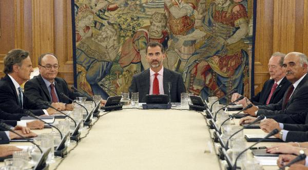 Entre los 19 asistentes, reunidos en torno a una mesa presidida por Felipe VI, figuraba el presidente de la Región de Murcia, Alberto Garre, así como el director del Instituto Cervantes, Víctor García de la Concha.