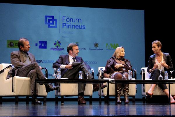 El moderador del foro y director de la Fundeu Joaquín Muller (2i) y los escritores Javier Moro (i), Carmen Posadas (d) y Carme Riera, durante el II Fòrum dels Pirineus sobre el idioma español, que se celebra en Andorra. EFE/jromero