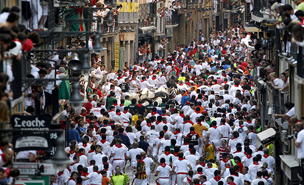 Runners are chased by the bulls from the Miura ranch during the eigth ‘encierro’ or bull running in the Sanfermines 2013 Festival, in Pamplona, Spain, 14 July 2013. A 23-year-old Australian woman has been gored in her thorax during the last bull chase of the Fiesta de San Fermin 2013. EFE/Javier Lizon