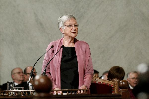 La lexicógrafa y doctora en Filología Románica, Paz Battaner, durante el acto de su ingreso en la Real Academia Española (RAE), que se celebra esta tarde en la sede de la RAE Madrid. EFE / Victor Lerena.
