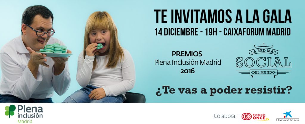 Plena Inclusión Madrid celebrará el próximo 14 de diciembre, a las 19:00 horas en CaixaForum Madrid, su gala anual para hacer entrega de los Premios Plena Inclusión Madrid 2016 y presentar su campaña anual de sensibilización social.