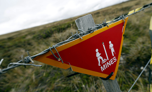 (ISLAS MALVINAS), 11/03/2013.- Una señal de alerta sobre un territorio minado vista hoy, lunes 11 de marzo de 2013, entre Port Standley y Goose Green, en Las Malvinas. Las autoridades de las Malvinas darán a conocer el resultado del referendo celebrado en las islas para que sus habitantes se pronuncien sobre si quieren permanecer bajo soberanía británica. EFE/JAVIER LIZÓN