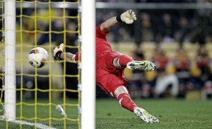 VILLARREAL (CASTELLÓN), 21/03/2012.- El portero del Real Madrid, Iker Casillas, encaja el primer gol del Villarreal CF, conseguido por Marcos Senna, durante el partido, correspondiente a la vigésimo novena jornada de Liga en Primera División, que los dos equipos disputan, esta noche, en el estadio de El Madrigal, en Villarreal. EFE/Manuel Bruque.