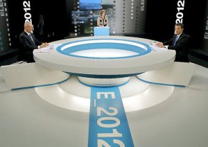 Alberto Núñez Feijóo (d), y Pachi Vázquez (i), en el primer debate electoral de las elecciones gallegas (Santiago, 8/10/2012).
