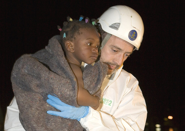 Un miembro de Salvamento Marítimo sostiene a una niña rescatada de una patera, Granada, (España, 2011)