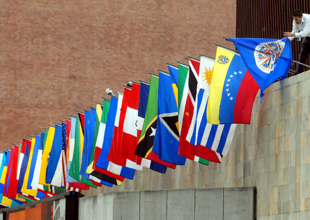 Banderas de los países miembros de la Organización de Estados Americanos (OEA) en el Centro de Convenciones de Medellín (Colombia, 30/5/2008).