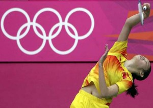La china Xuerui Li, medalla de oro, durante la semifinal individual de bádminton en los JJ. OO. de Longres 2012.