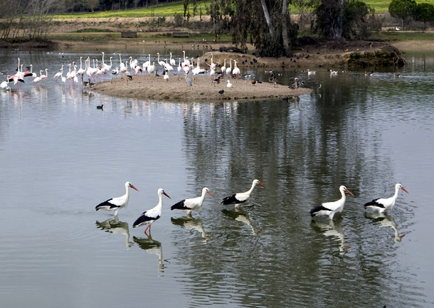 Un grupo de cigüeñas y flamencos comparten la misma área en la Cañada de los Pájaros (Doñana).