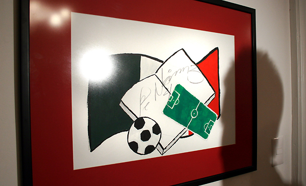 MEXICO-ALTRUISMO:MEX40-CIUDAD DE MÉXICO (MÉXICO), 07/11/07.- Vista de la obra del futbolista mexicano Rafael Márquez, jugador del Barcelona hoy, 07 de noviembre de 2007, quien dibujó una bandera de su país, una cancha de fútbol y un libro en esta pintura que será subastada a favor de la promoción de la lectura en México. El dibujo de Márquez, capitán de la selección mexicana de fútbol, forma parte de una serie de dibujos de personalidades relacionados con la lectura que serán subastados este miércoles en la capital mexicana. EFE/Jorge Gutierrez