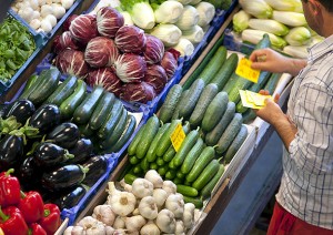 Un empelado etiqueta pepinos en un mercado de Fráncfort (Alemania, 30/5/2011)