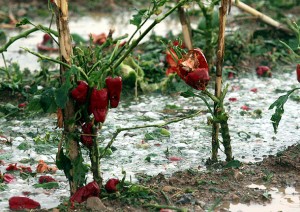 Detalle de una plantación de pimientos, en los Monegros de Huesca, tras una descomunal tormenta de granizo.