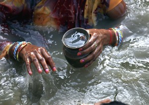 Una mujer hindú toma agua bendita del Ganges durante el ritual Tarpan, en Calcuta (India, 27/9/2011).