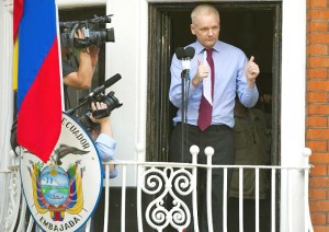 Julian Assange en un balcón de la embajada de Ecuador en Londres (19/8/2012).