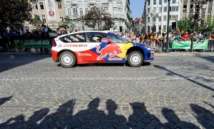 epa02170227 Kimi Raikkonen of Finland driving a Citroen C4 WRC in action during the Rally of Portugal Porto´s Roadshow held at the Aliados Avenue in downtown Porto, Portugal, 23 of May 2010. EPA/FERNANDO VELUDO © 2010