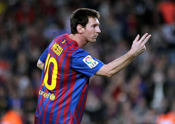 El delantero argentino del FC Barcelona, Lionel Messi, celebra su triplete en el estadio Camp Nou (29/10/2011).