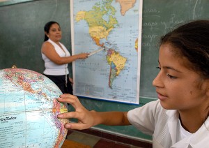 Una estudiante de primaria señala en un globo terráqueo el continente americano (Honduras,14/4/2005)
