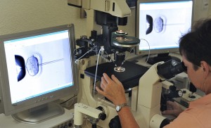 GERMANY SCIENCE RESEARCH:epa02811654 Laboratory director Verona Blumenauer inspects the microinjection of sperm into an egg cell using a microscope at the in vitro fertilization clinic, Kinderwunschzentrum Leipzig, in Leipzig,?Germany, 05 July 2011. The center in Leipzig is using a new device (Embryoscope) from Denmark, which unites the incubator, microscope and camera and which can monitor and evaluate the embryo until its transfer into the womb. The newest scientific findings prove that this allows a more exact detection of certain developments in the embryo and therefore can improve the pregnancy rate. EPA/WALTRAUD?GRUBITZSCH