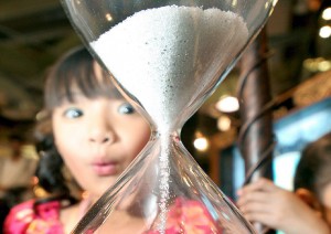 Una joven tailandesa mira un reloj de arena que deja caer diamantes (Bangkok, Tailandia)
