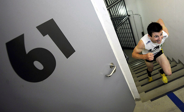 No se cansa de, en vez de no se cansa en, es la expresión adecuada para indicar que una acción se realiza con insistencia.