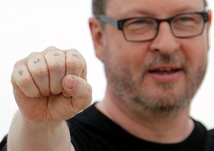 El director de cine danés Lars Von Trier mostrando su tatuaje en el pase gráfico de la película Melancholia.