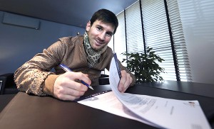 BARCELONA, 07/02/2013.- Fotografía facilitada por el FC Barcelona del delantero argentino, Lionel Messi, hoy en las oficinas del club azulgrana en el momento de la firma de la ampliación de contrato que le ligará al club hasta el 30 de junio del 2018. EFE/FC Barcelona