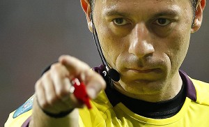 POLONIA FÚTBOL EUROCOPA 2012 ITALIA IRLANDA:AC07. POZNÁN (POLONIA), 18/06/2012.- El árbitro turco Cuneyt Cakir señala una infracción hoy, lunes 18 de junio de 2012, en un partido de la Eurocopa 2012 entre Italia e Irlanda en Poznán (Polinia). EFE/ADAM CIERESZKO/