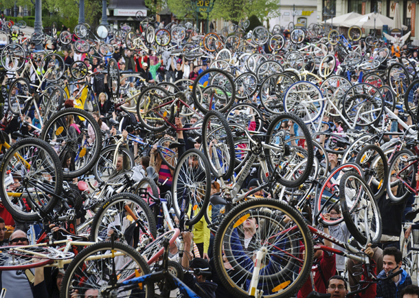 Cientos de personas alzan sus bicicletas con motivo del Día de la Tierra en Debrecen (Hungría, 2012)