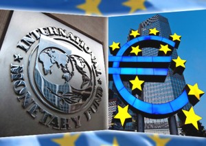 Símbolo del FMI y del BCE sobre la bandera de la UE