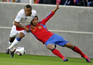 El español Martín Montoya (dr.) y el inglés Ryan Bertrand, durante el Campeonato de Europa Sub-21. (Dinamarca, 12/6/2011)