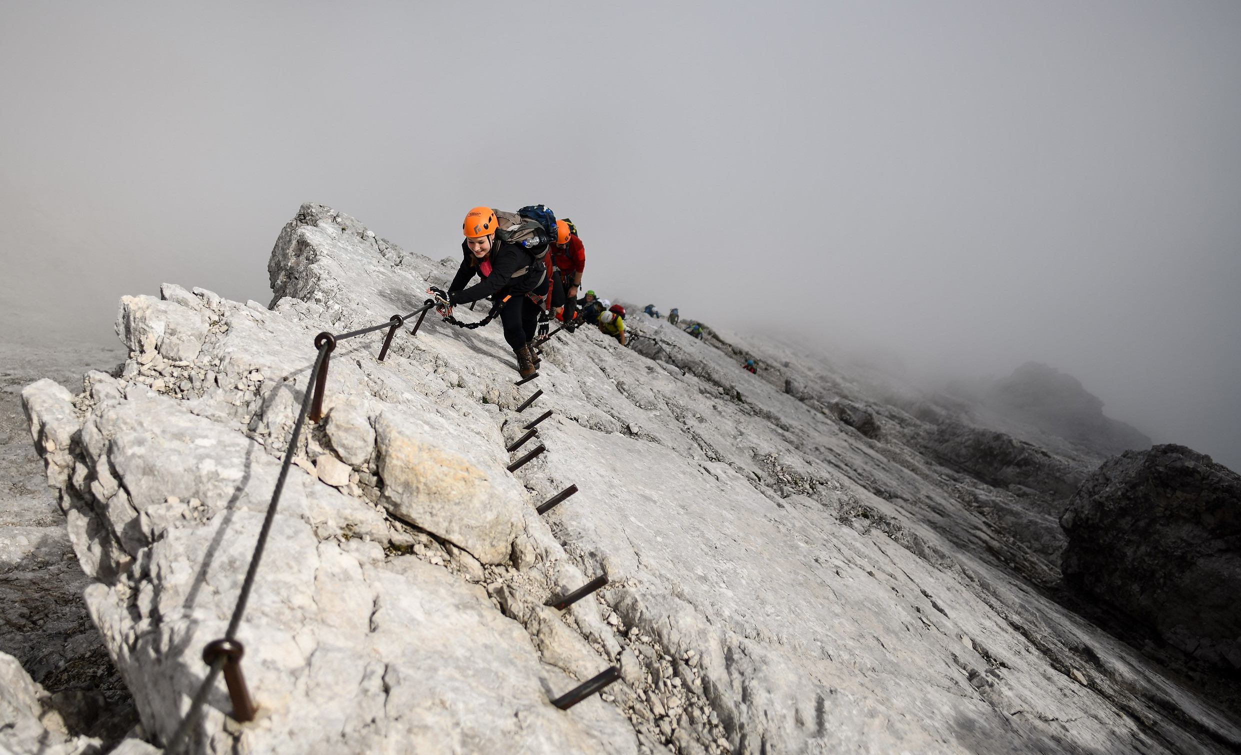 El giro italiano via ferrata alude a un itinerario que transcurre por paredes o zonas rocosas equipado con clavos, grapas, pasamanos, cadenas y otros elementos similares para que resulte más seguro a personas no habituadas a la escalada.